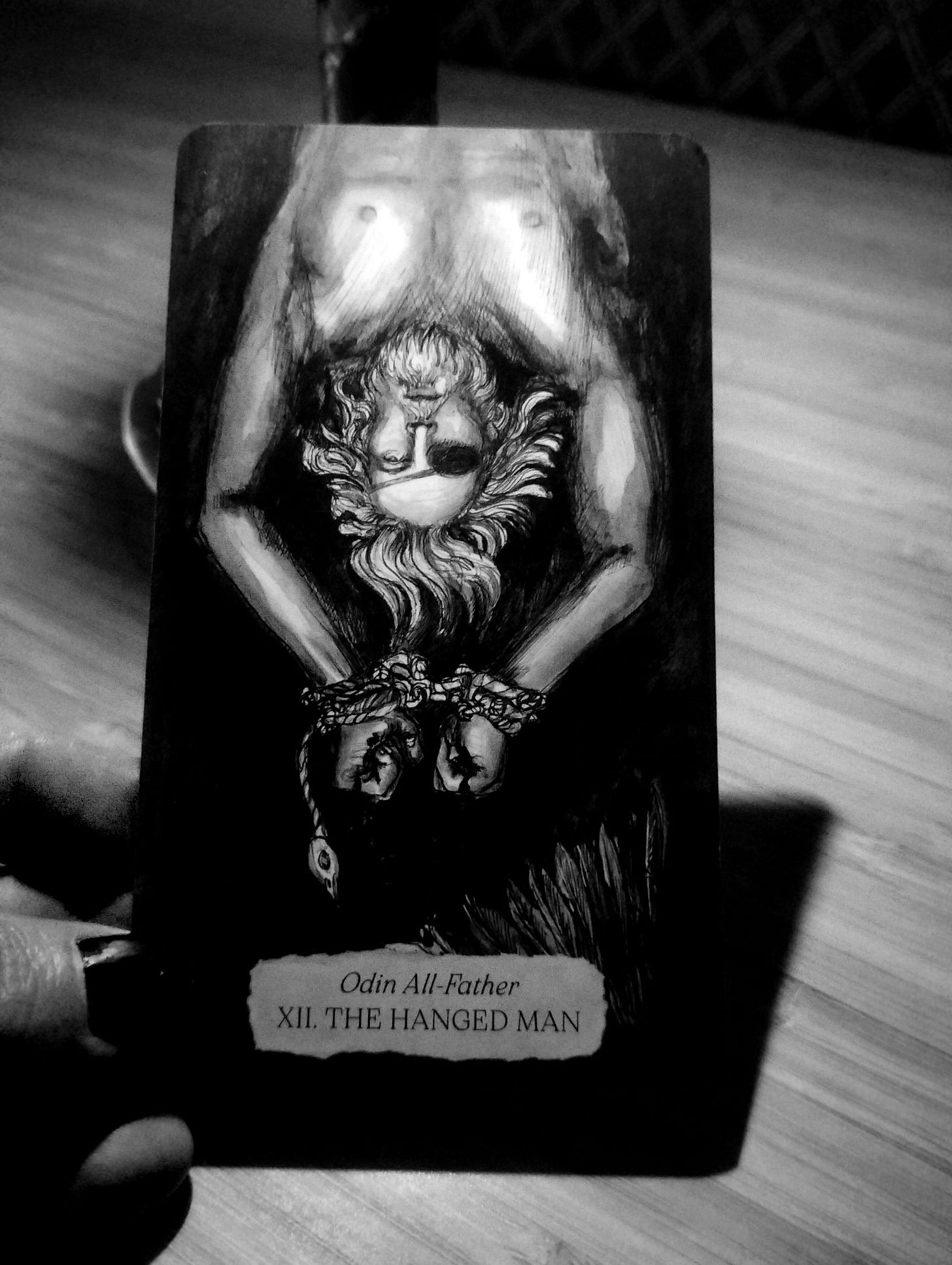 Another energetic thread that is coming up as I feel into sacred surrender, is the hanged man. In this particular deck, Bonestone and Earthflesh Tarot, the hanged man is Odin and is represented by the lore of him sacrificing his eye. He hung upside down from the Yggdrasil, the world tree, pierced his eye with a spear and peered into the dark waters of the below. As he hung for nine days and nine nights, he called to the runes. When they revealed themselves to him, this was the sign his sacrifice was accepted. This is a reminder that there is a discomfort in the liminal that we currently reside in. But that there is guidance available. You need not stick spears in your eye as sacrifice, but it is likely that at this time there does need to be a shifting of worldview based on whatever information or guidance comes through, that its not something that can be rushed but instead needs a dip beneath the surface. This is sacred shadow work, when we come up against an edge that we are being invited to meet but it changes something about how we see ourselves or how we see the world, its a call to the meat hook if your familiar with Inanna, the world tree, the descent.