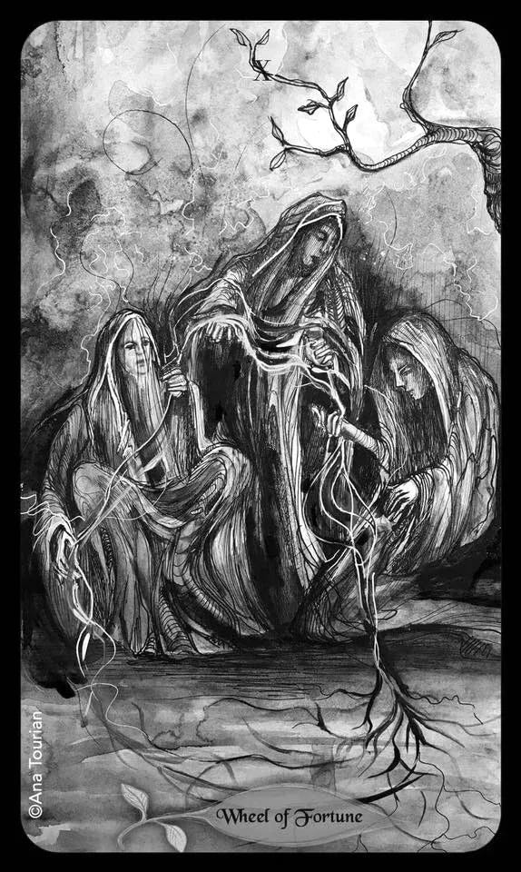You know, what really wants to be said today as I write this is what feels alive for me right now, and that’s not diving into the intricacies of the astrology. Im feeling that what is most alive for me right now is dissolving into the full trust of the universe. We are in a wheel of fortune year, and the imagery on my deck that i’m using at this time, shows the Norns, the Norse weavers of fate. They reside in the great below at the roots of the Yggdrasil, the world tree, where past present and future converge. the Norns, weave the intricate tapestry of life. Urd draws on the memories of what has been, Verdandi intertwines the present with the threads of what could be, and Skuld threads from the mysteries of what is to come. This card has been coming up alot in spreads, both personally and for part of an upcoming container where I will be holding a cohort of 12 magicians within The Magicians table. This card coming up for me as Mercury stations RX in Pisces feels like a trust fall into all that has been unravelling, dissolving and re structuring over the last year. Do you believe in fate? That it has already been written? My desire is not in answering this question, and it has spun me out multiple times as I have made attempts to grapple with will, fate, inevitability. Instead I write poetry and hold hands with the trees.